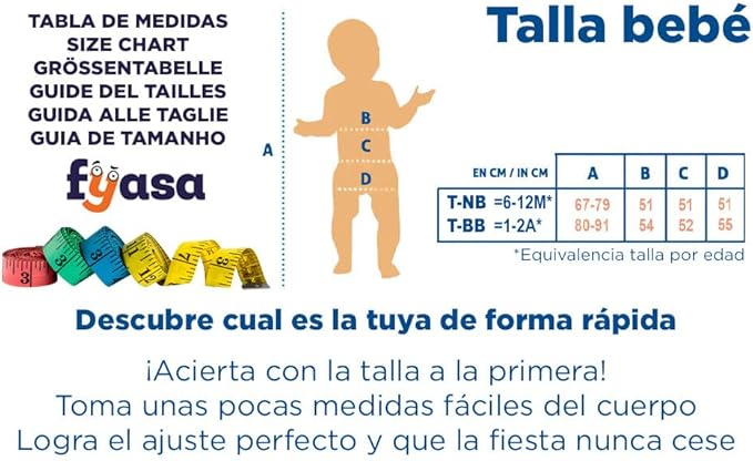 Este disfraz es ideal para Carnaval, fiestas temáticas, eventos escolares o sesiones de fotos especiales. Su formato tipo mono facilita el movimiento del bebé y permite vestirlo y desvestirlo con rapidez, algo fundamental en disfraces para esta edad.
