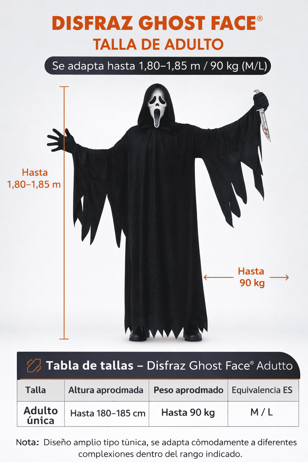 Incluye: túnica negra larga con capucha, guantes, cinturón y máscara Ghost Face®, creando un conjunto completo listo para causar impacto desde el primer momento.