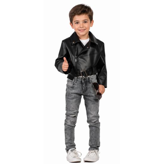 Esta chaqueta de cuero para niños imita el look clásico de los greasers de la película. Con detalles realistas y costuras definidas, es ideal tanto para disfraces completos como para darle un toque de estilo retro a cualquier atuendo infantil.